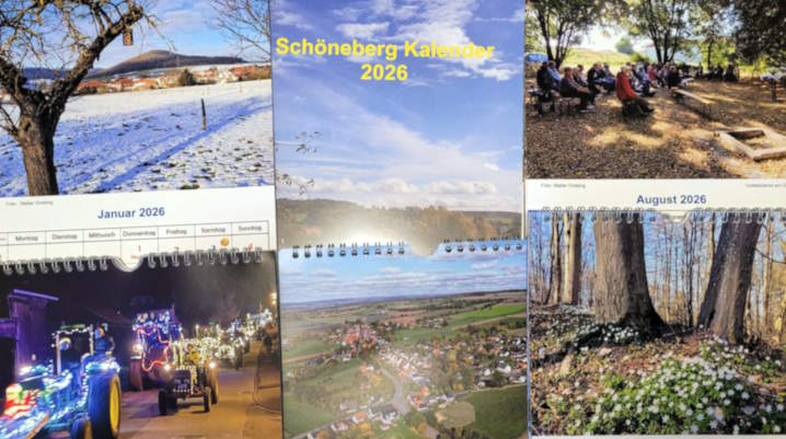 Der Schöneberg-Kalender des Heimatvereins für das Jahr 2026 ist fertig! Er zeigt wieder Motive aus unserem Ort. Erhältlich ist er zum Preis von 5,00 EUR in DIN A4 oder 8,00 EUR in DIN A3 bei den kpmmenden Veranstaltungen, bei Walter Grebing oder gerne auch per Email: Hier klicken