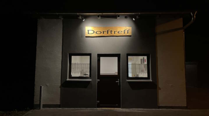 Am Dorftreff wurde heute ein Schild mit zwei Strahlern über dem Eingang montiert. Die Schrift wurde vorher mit Hilfe eines Beamers auf das Holzbrett gebracht. Jetzt ist der Dorftreff als solcher von außen gut zu erkennen. Wieder geht ein herzliches Dankeschön an die ehrenamtlichen Helfer!