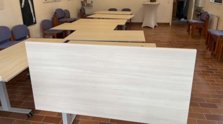 Die neu beschafften rollbaren Klapptische wurden angeliefert. Es handelt sich um vertikal klappbare Tische auf Rollen. Diese können auch von nur einer Person leicht und ohne viel Kraft umgebaut werden. Finanziert wurde die Anschaffung mit Fördermitteln. Vielen Dank dafür!