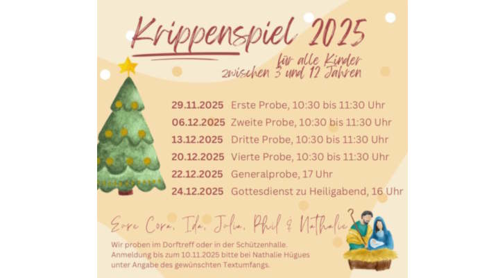 Auch in diesem Jahr wird es Heiligabend wieder ein Krippenspiel geben. Kinder zwischen 3 und 12 Jahren, die dabei mitwirken wollen, können bis zum 10. November 2025 bei Nathalie Hügues angemeldet werden. Die Proben beginnen dann am 29. November 2025 um 10:30 Uhr.